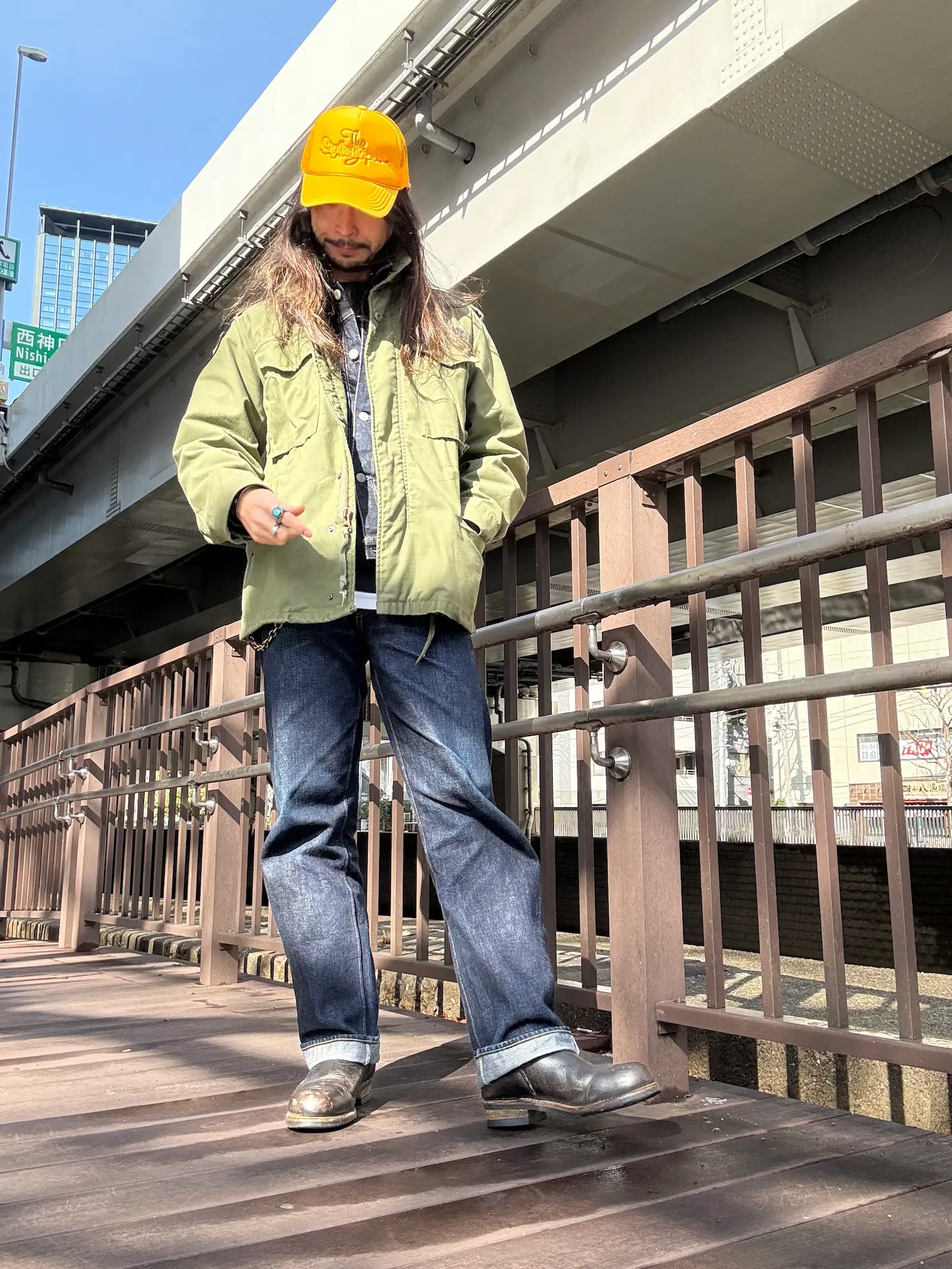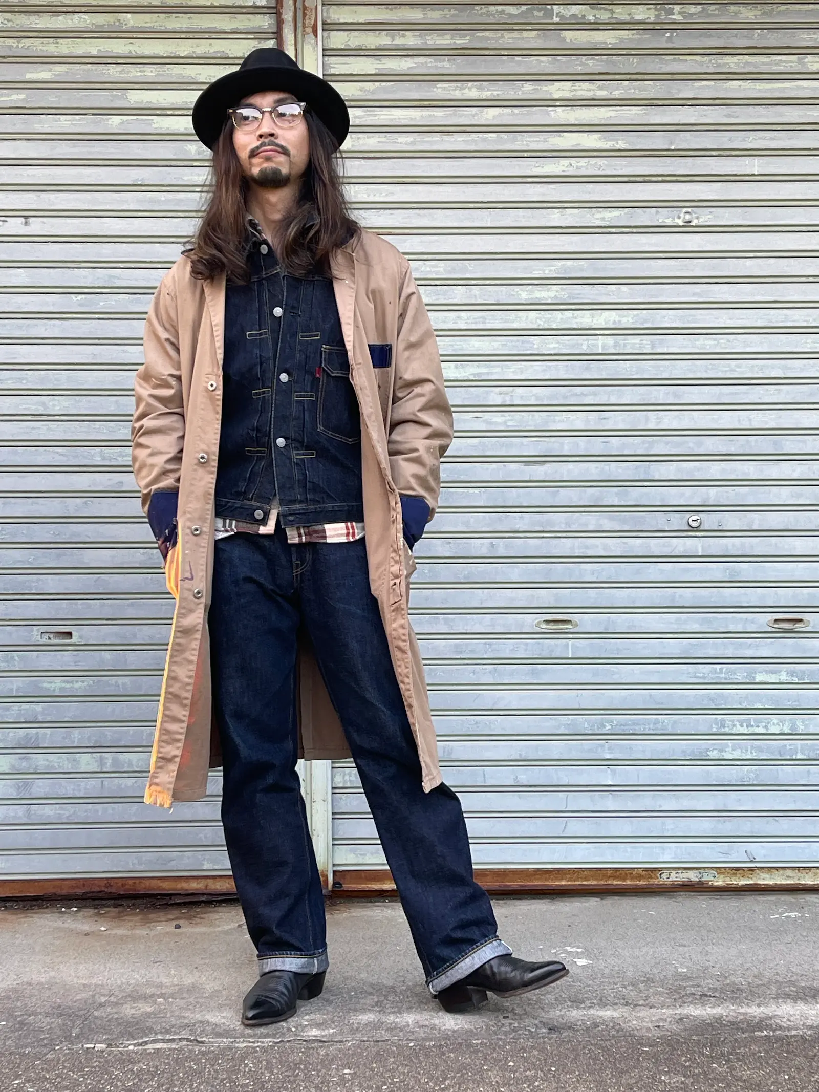 濃いインディゴの“面”を、コートで品よく整える。足元はウエスタンで抜け感。