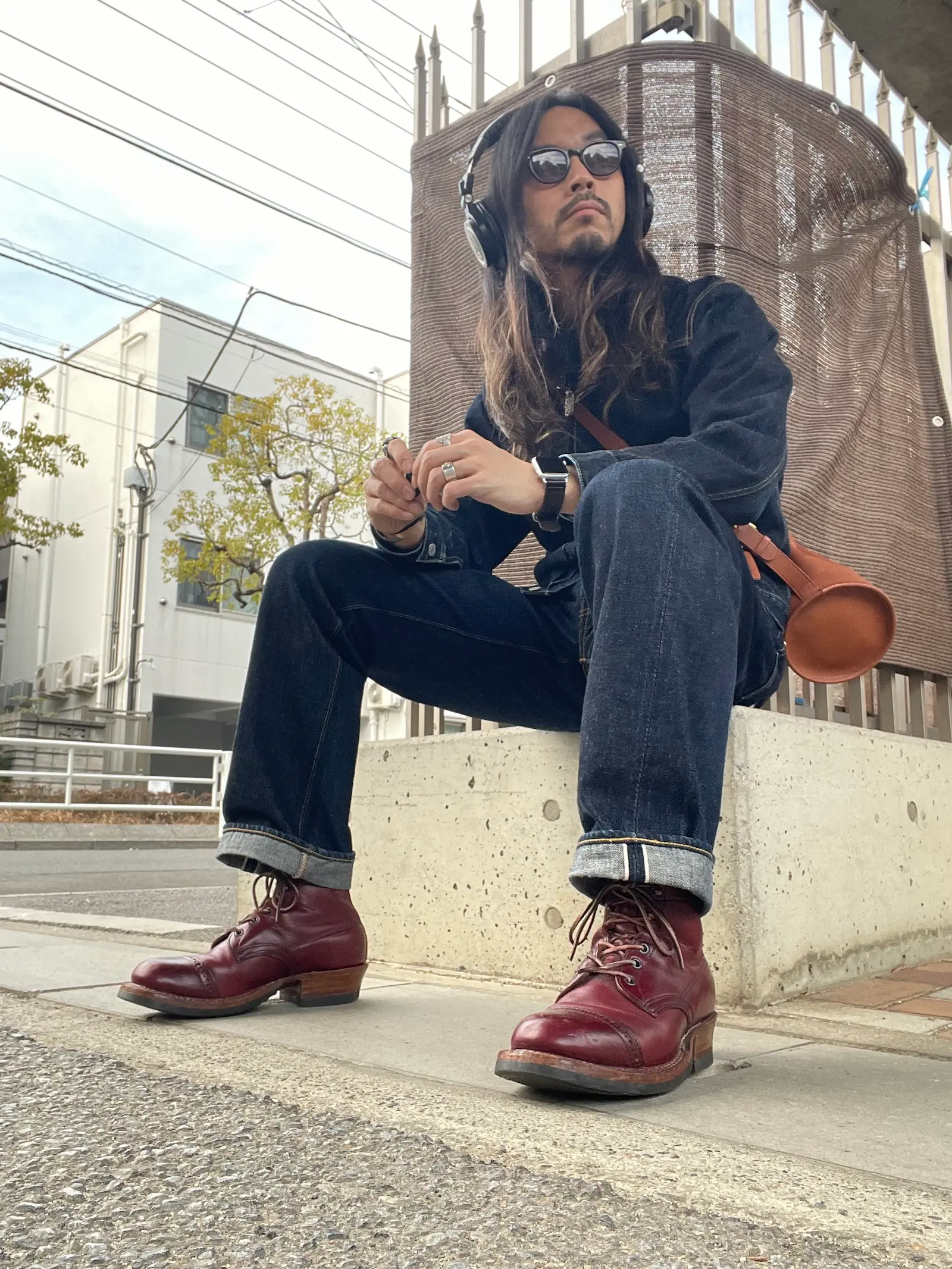 0105XXは裾幅に余裕があるので、ロールアップの“アタリ”も育て甲斐あり。赤茶ブーツとも相性◎。